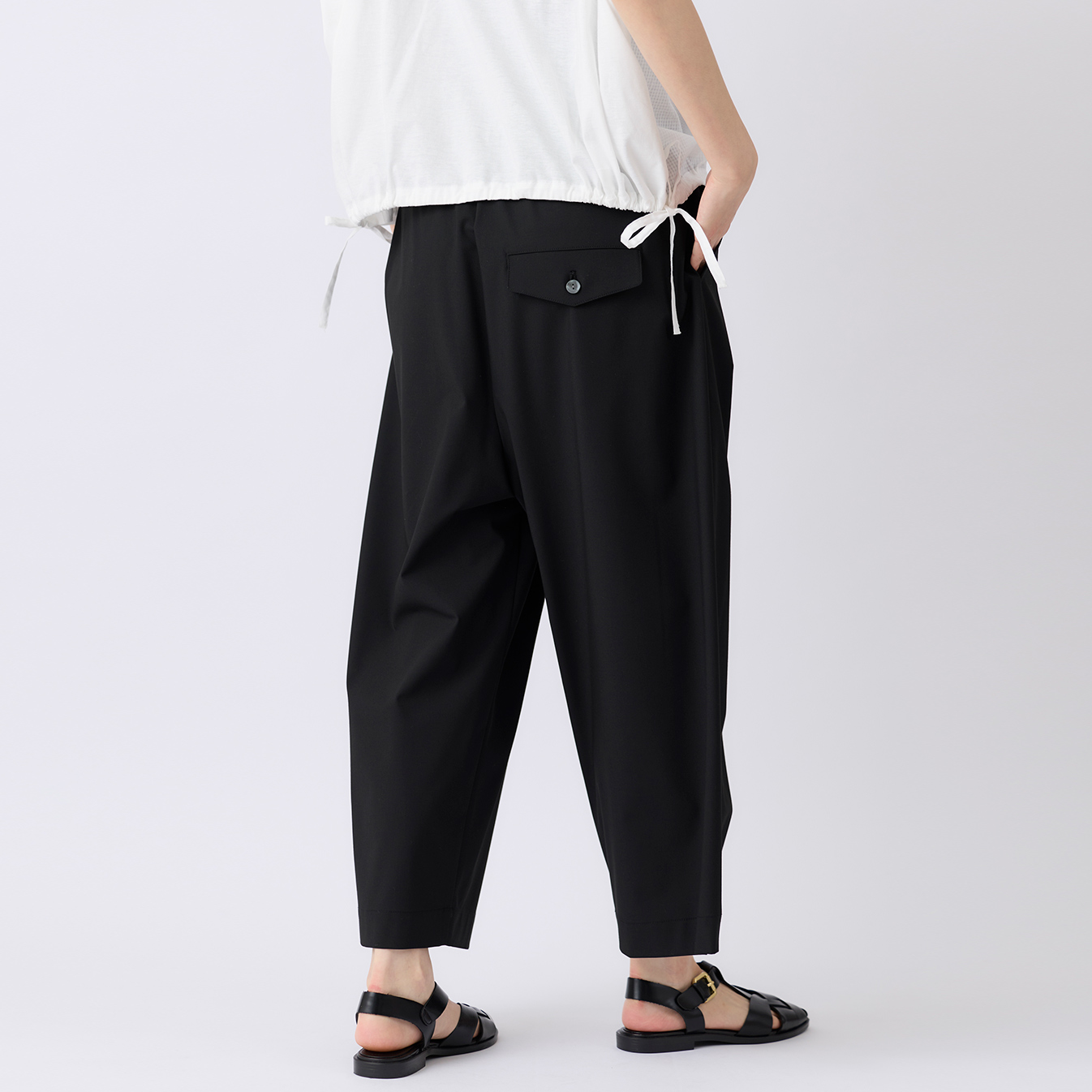 バックスタイルは、後ろボタン下にタックを入れることで立体感のあるシルエットに。